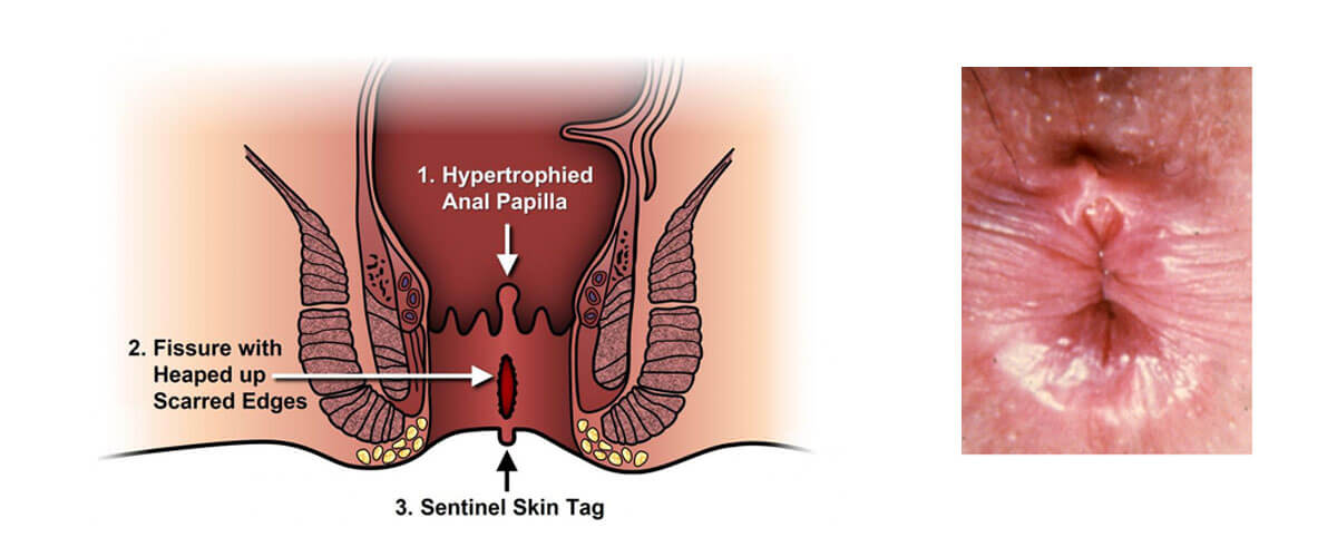 An anal fissure is a linear ulcer in the lower half of the anal canal and extends from just below the dentate line to the margin of the anus (anal verge). The ulcer may be acute, recurrent or chronic and may occur alone or with other rectal disease, most commonly hemorrhoids. An anal fissure is one of the chief causes of anal pain; in the acute case it is severe enough to incapacitate the patient. In fact it is a disease of the anus which causes an amount of suffering out of proportion to the size of the lesion. It is common in both the sexes and is encountered in young or middle aged adults, but is sometimes seen at other ages including infancy and early childhood.